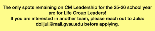 Read over the CM Leadership Team descriptions to know what opportunities are available.